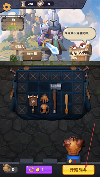 1、整理背包中的武器、防具等物品,点击开始战斗按钮,与哥布林等怪物对战。