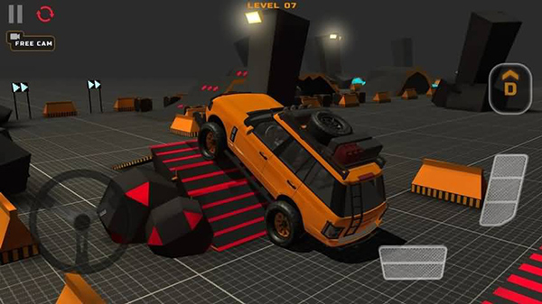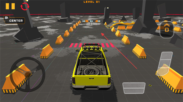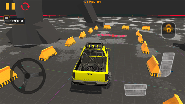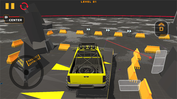 1、驾驶黄色越野车,在布满橙色障碍物的赛道中,通过方向盘控制方向,油门加速前进,沿着赛道指示路线行驶。