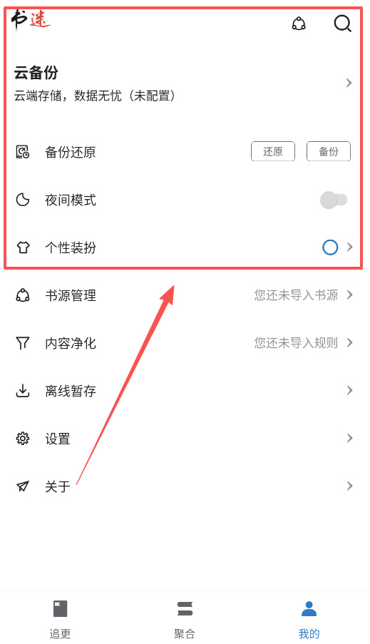 4、担心数据丢失的话,可以在“我的”页面配置“云备份”功能,这样你的阅读数据和设置就能安全地存储在云端了。