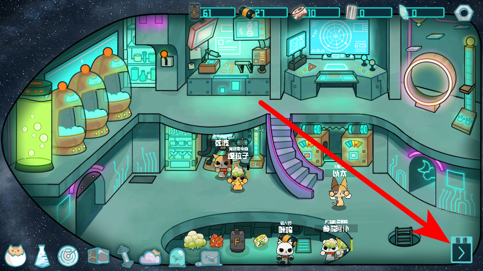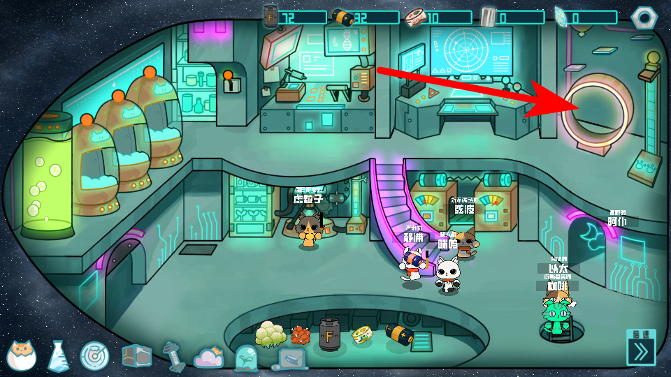 2、在飞船场景中,我们需找到传送门类建筑,点击进入,这是开启训练或任务环节的关键操作,准确点击后可进入训练界面,为猫咪提升战力创造条件。