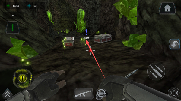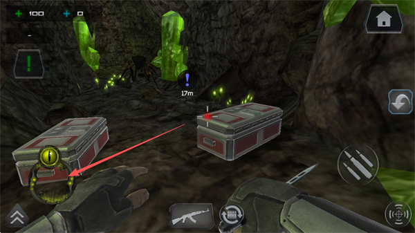 1、在洞穴场景中,操控角色移动,靠近宝箱获取资源,提升装备和弹药储备。