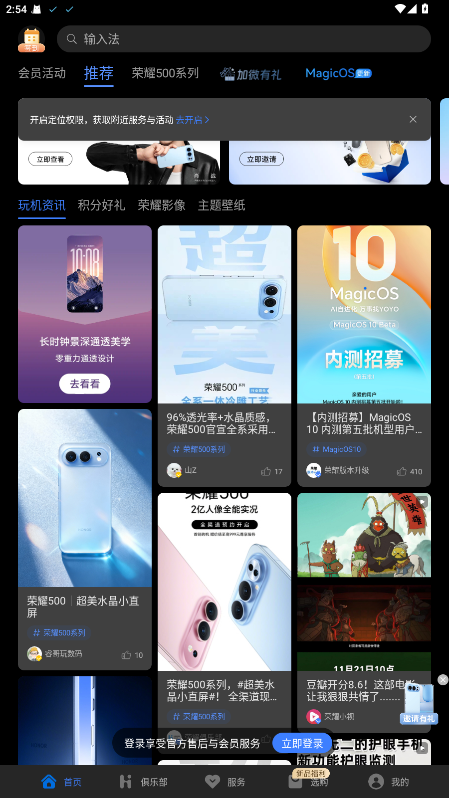 1、打开我的荣耀app,在首页,用户可以看到会员福利以及关于荣耀手机的信息;