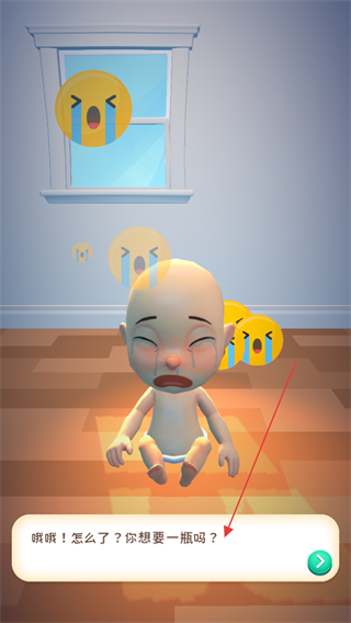 1、根据提示,选择对应物品满足婴儿需求,点击箭头推进流程。