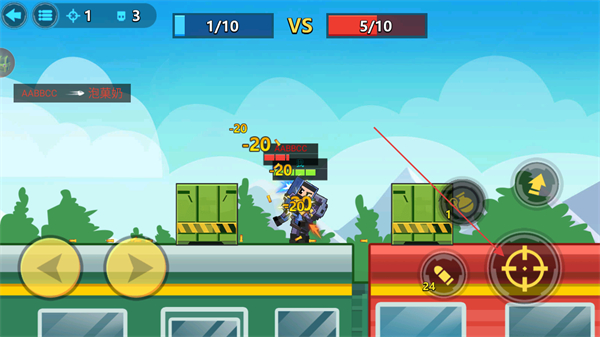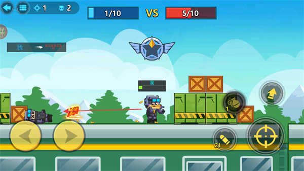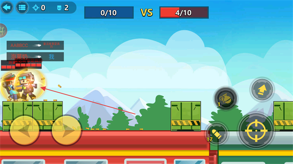 1、操控角色移动,点击攻击按钮射击敌方角色,积累击杀数。