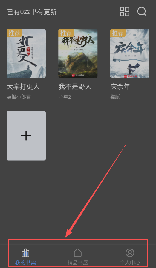 3、在我的书架中,你可以管理自己收藏的书籍,并查看它们的更新状态,推荐区为你提供类似卖报小郎君、猫腻等作者的热门作品。