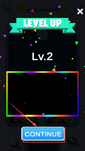 4、升级继续:出现LEVEL UP Lv.2 CONTINUE 1ot时,点击CONTINUE进入下一级。