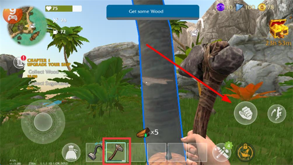 3、切换工具采集资源,在道具栏中选择斧头类工具,对场景中的树木进行互动,每次采集可获得木材。