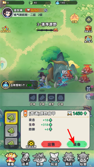 3、获得装备后,点击装备按钮可穿戴该装备,装备提升角色攻防属性,这是强化战力步骤。