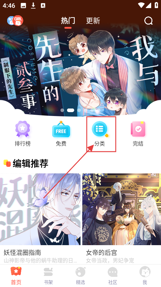 1、我们在软件首页,能看到热门漫画推荐和排行榜、免费等功能入口,点击【分类】,就能进入漫画分类页面啦。