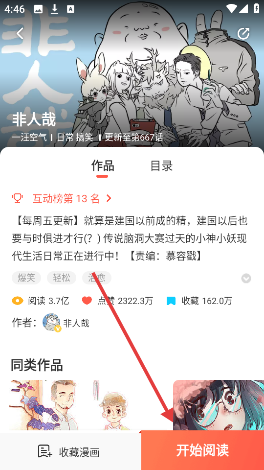 4、进入漫画详情页面后,我们可以看到漫画的简介、阅读量等信息,点击【开始阅读】,就能开始阅读漫画啦。