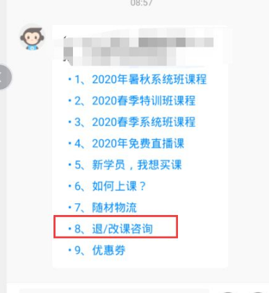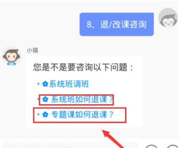 3.进入猿辅导的在线客服面板点击下方的【退/改课咨询】链接。
