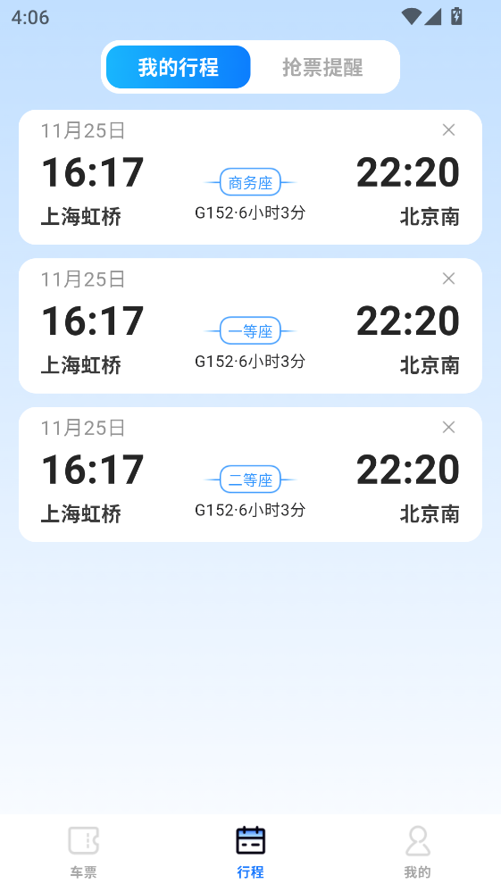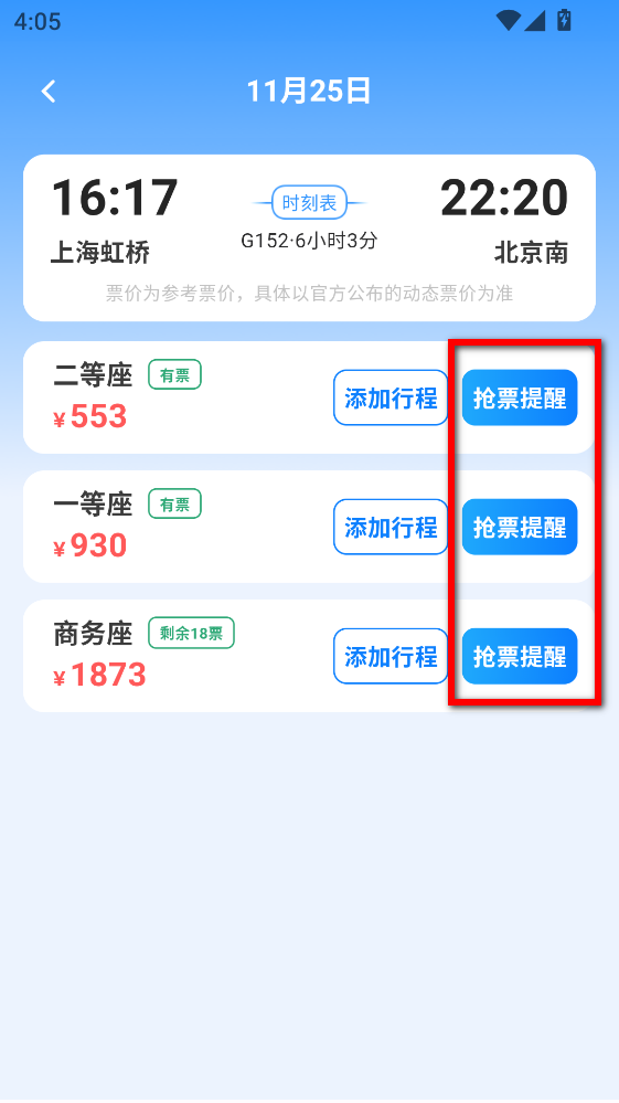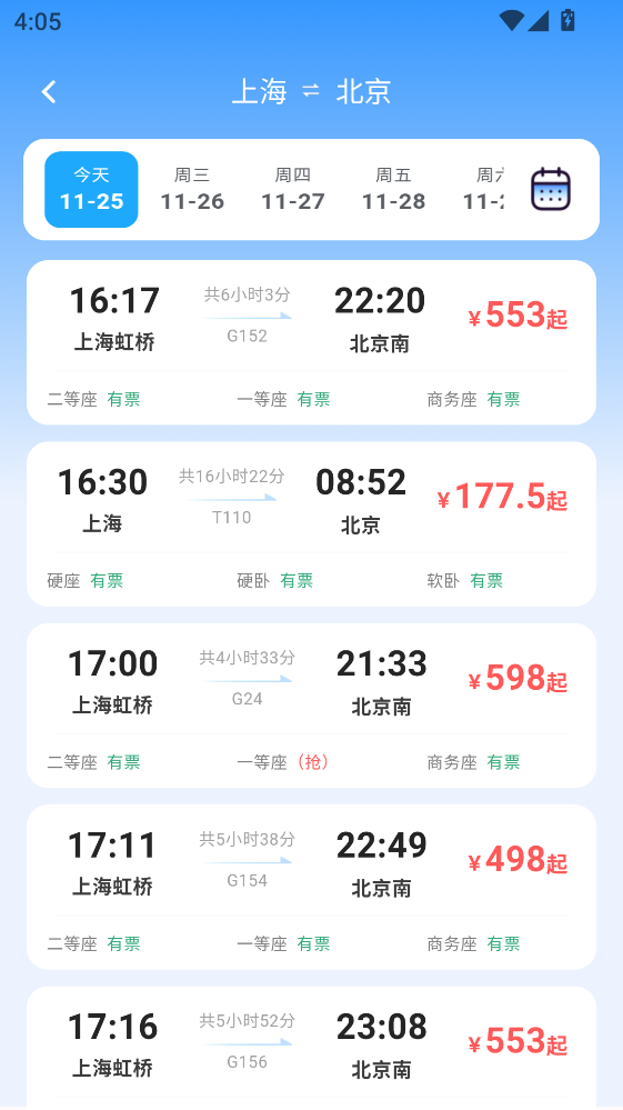 1.打开软件之后就可以看到各种火车票信息,修改起点和终点,以及出发时间。