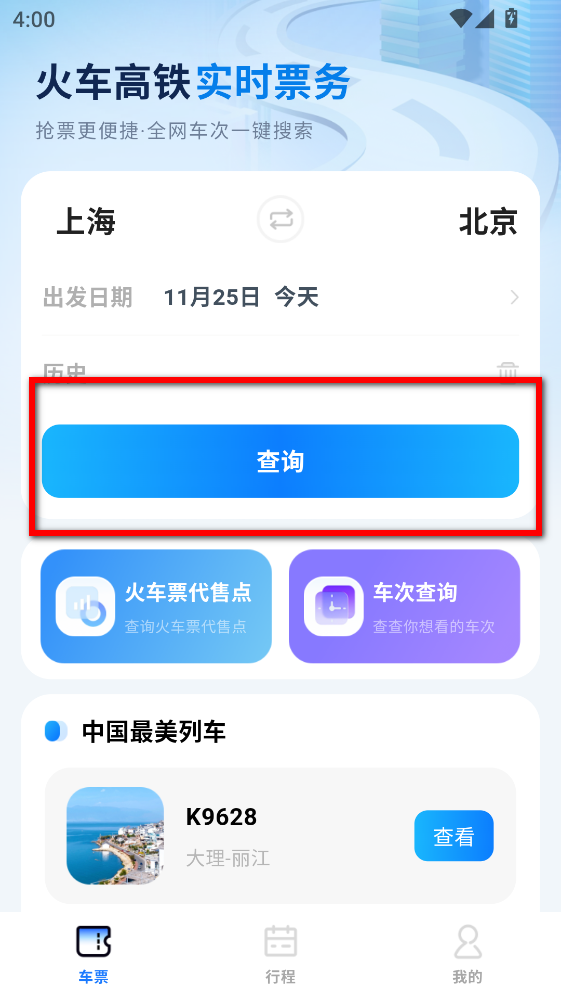 全国高铁火车票是一款专注于提供便捷高效的火车票查询和行程管理服务的移动应用,用户可以随时获取最新的火车和高铁车次信息,轻松查询全国范围内的车票详情。应用提供了详细的车次查询功能,帮助用户了解各个车站的发车时间、到达时间以及是否有票等信息。用户可以根据自己的需求,实时获取火车班次,确保出行安排的准确性和便利性。