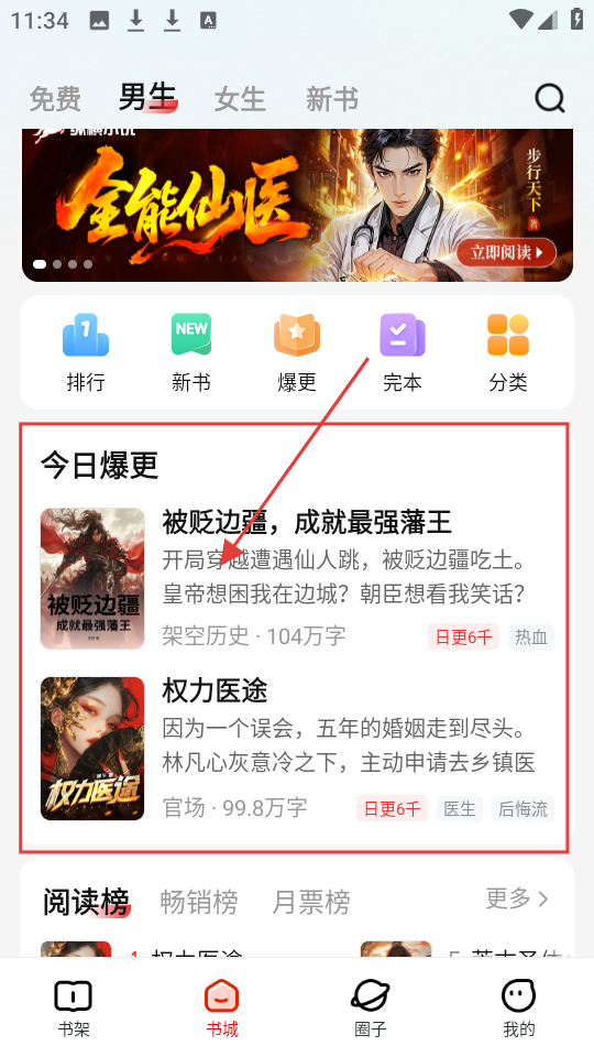 1、我们进入软件书城页面,能看到“今日爆更”里的各类书籍,若对某本书感兴趣,点击书籍标题,即可进入详情页啦。
