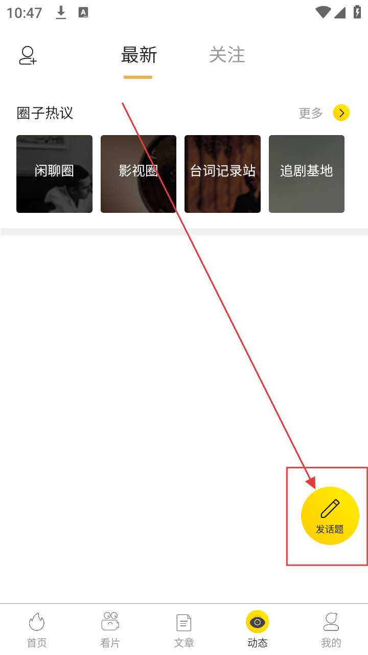 2、进入动态页面后,点击右下角黄色“发话题”按钮,可进入发布话题页面哦。