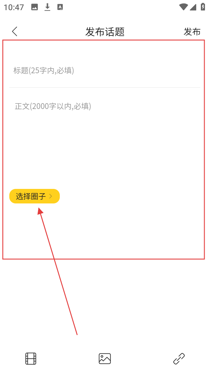 3、进入发布话题页面后,填写标题、正文,再点击【选择圈子】,准备选择话题所属圈子啦。