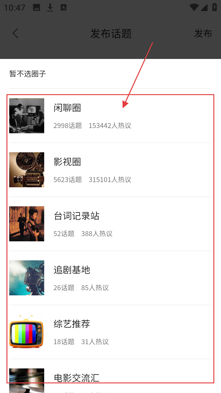 4、进入选择圈子页面后,可选择闲聊圈、影视圈等圈子,让话题发布更精准哦。