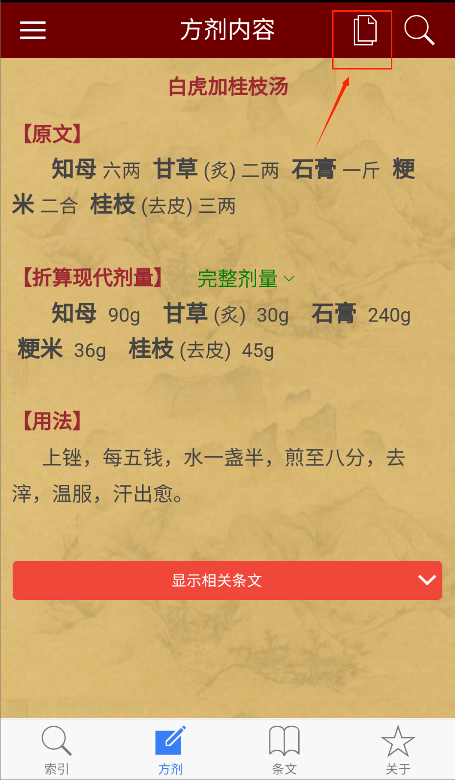 2、在方剂详情内容中,你可以点击右上角将整个方剂复制到剪贴板。