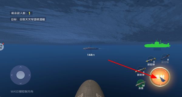 1、通过按键控制潜艇移动方向,调整位置靠近敌方目标,为发射武器攻击做准备。