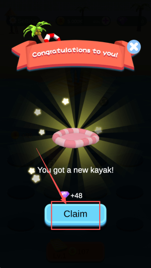 3、领取奖励:出现You got a new kayak! +48,点击Claim收取钻石。