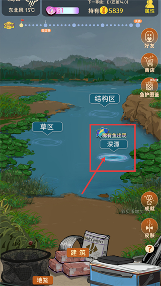 1、关注【深潭】区域的【稀有鱼出现】提示,优先选该区域钓鱼,同时留意【地笼】【建筑】功能按钮,拓展钓鱼辅助方式。