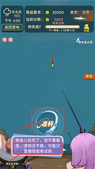3、看到【收杆】提示时先观察漂相稳定性,避免撞线或试探时操作,节省剩余【鱼饵-1次】,提升有效中鱼概率。