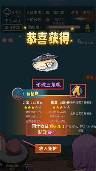 4、钓到【珍珠三角帆-底栖类】后点击【放入鱼护】,获取【预计收益-¥2260】与【彩贝-1】,积累熟练度推进晋级。