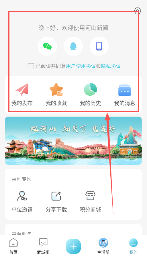 1、首先打开河山新闻app,在首页底部导航栏可以看到“首页、武城街、生活帮、我的”四个主要板块。