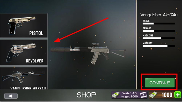 1、进入游戏后选择模式,选定后进入地图,先在商店界面挑选武器,点击对应装备后按继续键完成配置。