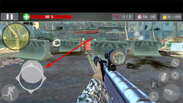 2、游戏界面左侧滑动控制人物移动,需借助掩体保持隐蔽,半蹲或卧倒能降低被发现概率,避开敌人视野范围。