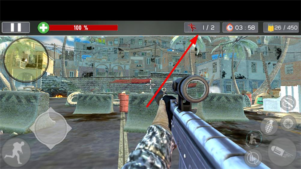 3、点击右侧开镜瞄准敌人,点击触发射击,遇到多个敌人时可投掷手雷,利用爆炸范围快速清除目标。