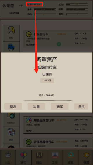 角色成年后即可解锁“工作”,这是游戏内主要财富的获取途径