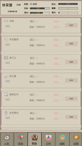 待积累到一定的财富后,我们还可点击“创业”快捷的积累更多的财富,当然公司也有倒闭的风险,玩家需要慎重考虑