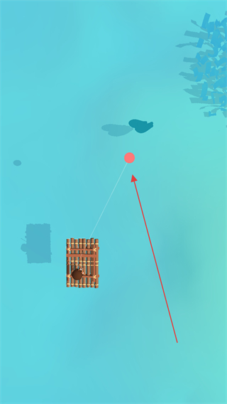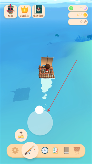 2、在海洋区域操控竹筏移动,使用下方工具栏的鱼竿,准备下竿钓鱼。