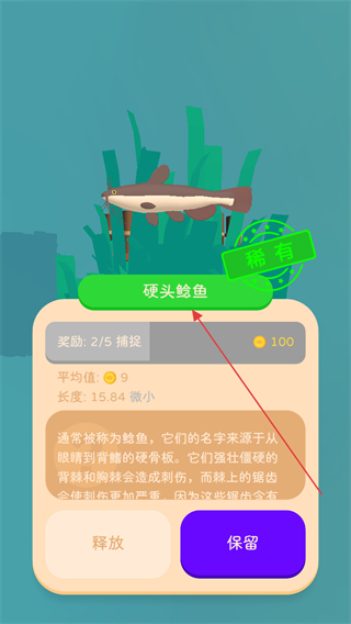 4、钓到硬头鲶鱼后,查看其介绍,点击保留按钮保存该鱼。
