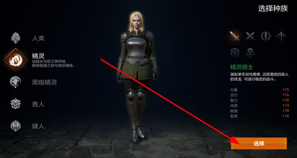 1、创建选择种族,比如精灵族,选定后可搭配对应职业如精灵骑士,该职业装配单手剑与盾牌,点击选择即可确定。