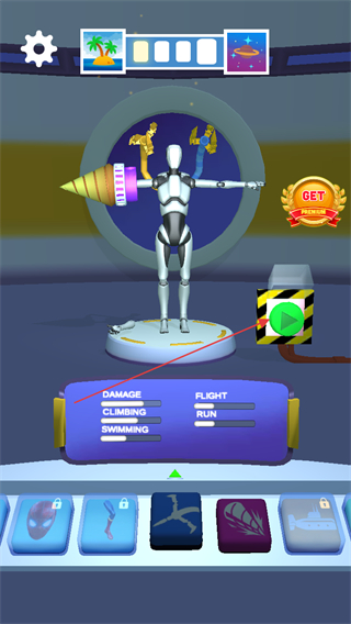 2、操控机器人在墙面攀爬,收集肢体部件,合并提升机器人能力。
