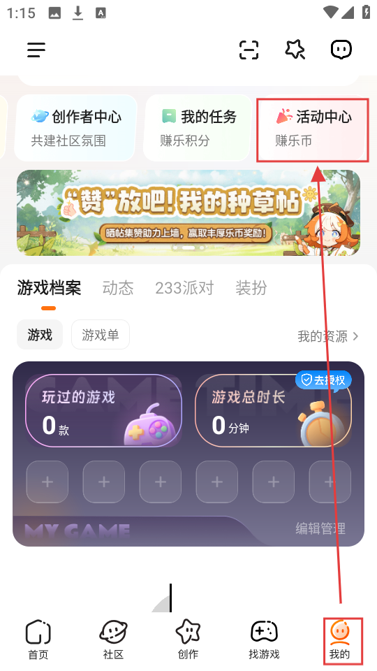 1、在“我的”页面,若想参与平台活动,点击【活动中心】选项,就能进入活动中心页面啦。