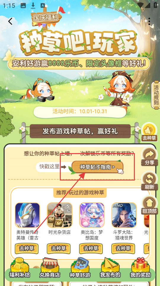 3、在“种草吧!玩家”活动页面,若想了解种草帖子怎么写,点击【种草帖子指南】选项,就能查看指南内容啦。