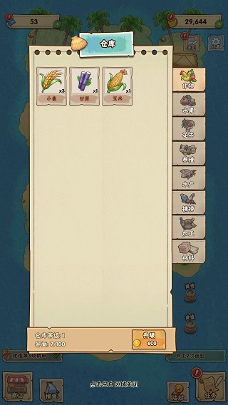 9、收获后的物品将被存入到仓库中,仓库里存放着所有物品,不过仓库有容量限制,这点同《外婆的小农院》一样,升级仓库可以提高容量。