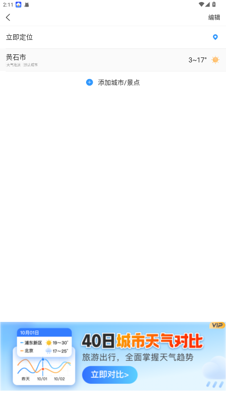 2.点击界面左上角 “+” 按钮,进入地区管理页面,输入目标城市或景点名称,即可添加该地区天气并随时切换查看。