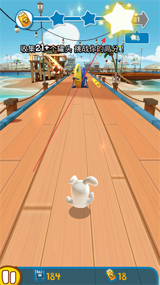 2、操控兔子沿赛道前进,收集沿途的罐头,积累数量。