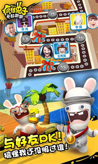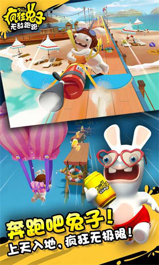 采用鲜明卡通画风,疯狂兔子形象搞笑可爱,游戏界面制作精良、色彩鲜艳,跑酷过程中的动作特效与场景切换流畅自然,带来愉悦的视觉体验与沉浸感。