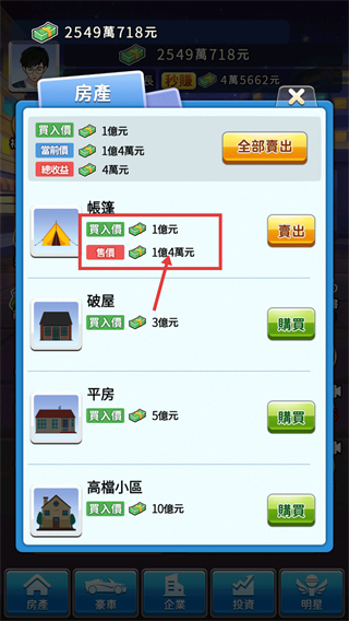 3、持有【帳篷】后,当【售價-1億4萬元】时可卖出,此时【總收益-4萬元】,点击【賣出】按钮实现获利。