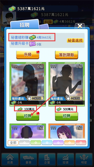4、【招聘】界面中,【秘書總秒賺-4萬5662元】是收益关键,可先花费【100萬元】招聘低级秘书开启收益。