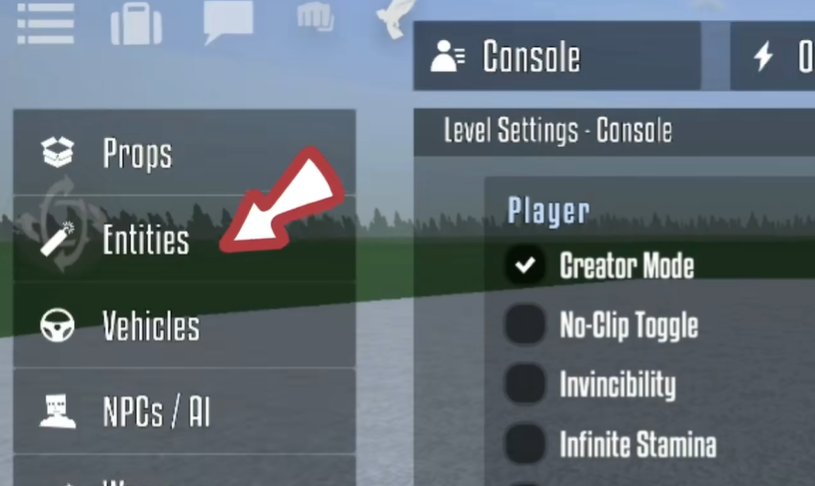 1、进入沙盒后,打开菜单选择第二个Entities选项