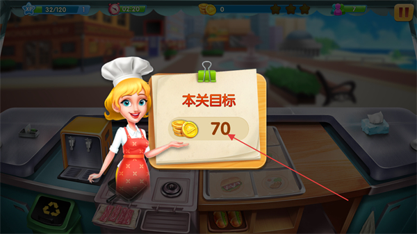 1、明确本关目标收集70金币,根据顾客需求如汉堡+饮品,在操作台制作对应食物。