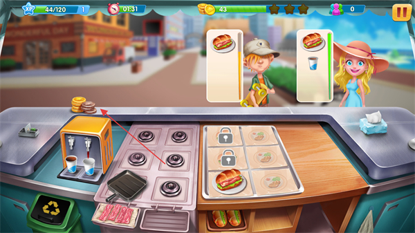 3、持续接收顾客订单、制作并交付食物,直到金币数量达成目标。