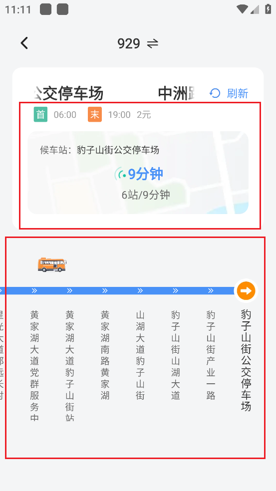5、点击符合要求的线路进入,这里可以查看到全线路的站点信息,公交到达当前候车站时间,以及首末发车时间点和票价等信息。