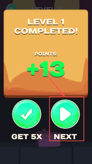 4、完成领奖:显示LEVEL 1 COMPLETED! POINTS:+13,点击GET5X NEXT进入下一关。